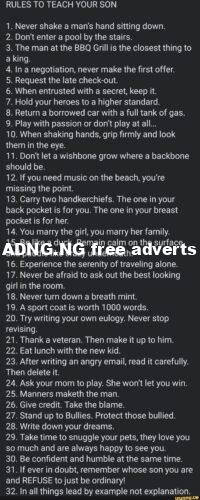 13. Carry two handkerchiefs. The one in your back pocket is for you. The one in your breast pocket is for her.