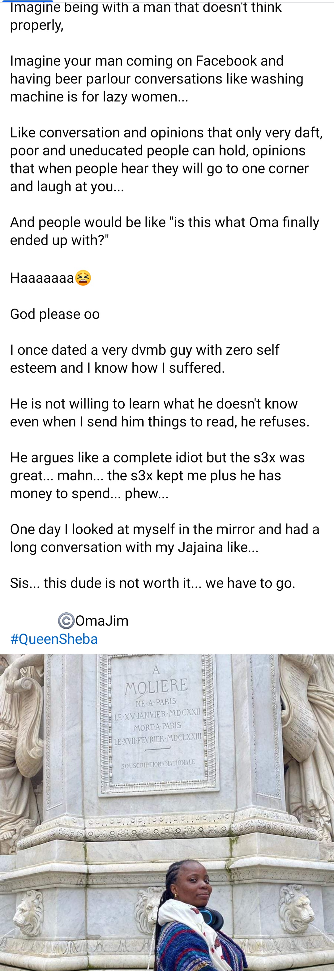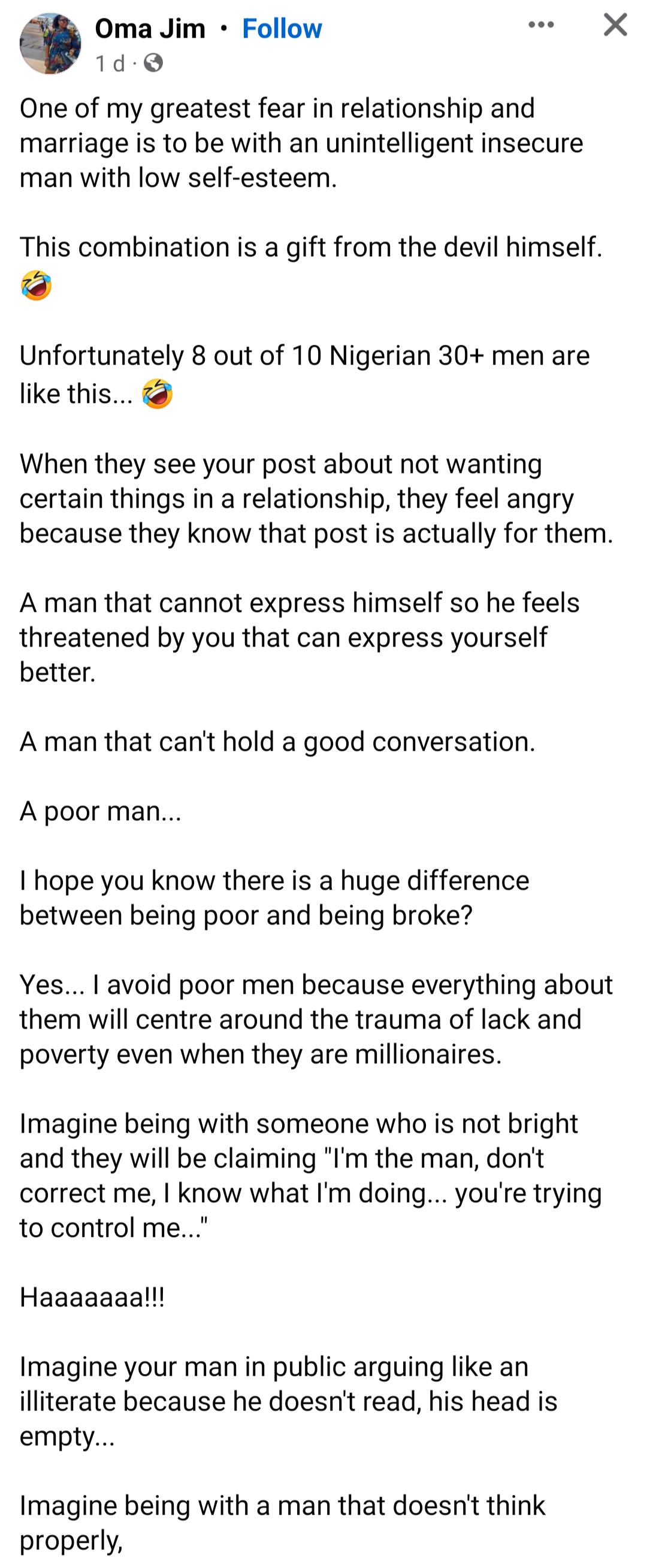 A social activist has gone on Facebook to share her greatest fear in a relationship and marriage. Oma Jim wrote: “One of my greatest fear in relationship and marriage is to be with an unintelligent insecure man with low self-esteem.” She added: “Unfortunately 8 out of 10 Nigerian 30+ men are like this…” She went on to detail how such men can be a source of embarrassment to the women they’re with. “Imagine being with someone who is not bright and they will be claiming ‘I’m the man, don’t correct me, I know what I’m doing… you’re trying to control me…’ “Imagine your man in public arguing like an illiterate because he doesn’t read, his head is empty… “Imagine being with a man that doesn’t think properly, “Imagine your man coming on Facebook and having beer parlour conversations like washing machine is for lazy women…” Read her entire post below.