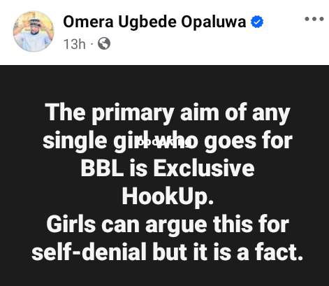 A Nigerian man, Omera Ugbede Opaluwa has said that single girls undergo Brazillian Butt Lift surgery in order to engage in exclusive hookup.’ The post The primary aim of single girls who undergo BBL is H00kup” – Nigerian man says Appeared first on X.ADNG.NG FREE ADS TO 10000 SOCIAL MEIDIA USERS DAILY.