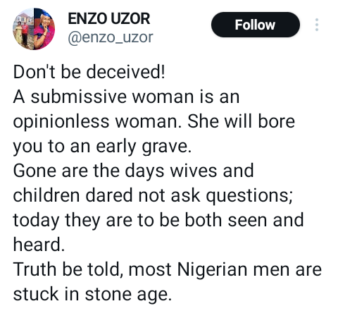 A Nigerian man, Nzeribe Uzodimma, has described a submissive woman as one without an opinion. Don’t be deceived! A submissive woman is an opinionless woman. She will bore you to an early grave. Gone are the days wives and children dared not ask questions; today they are to be both seen and heard. Truth be told, most Nigerian men are stuck in stone age, he wrote on Wednesday. The post A submissive woman is an opinionless woman. She will bore you to an early grave – Nigerian man says appeared first on dotifi.com start an online business for free and earn .