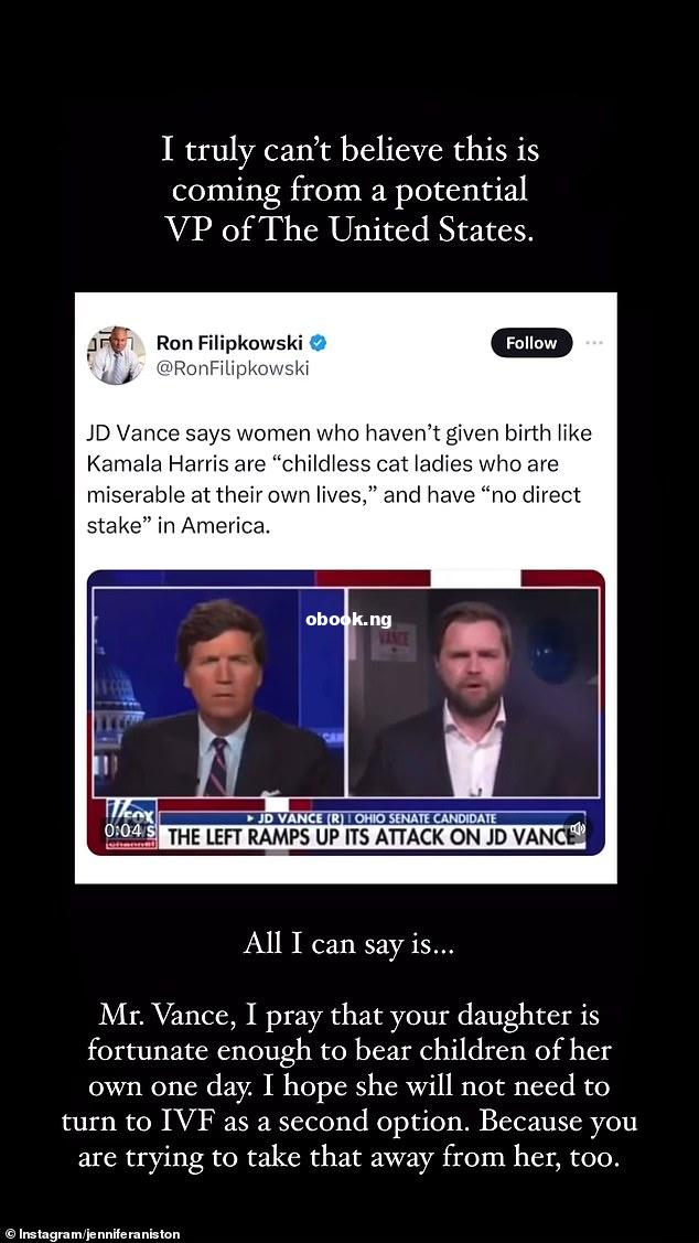 American actress, Jennifer Aniston has slammed Donald Trump’s running mate, J.D. Vance for his viral comments about ‘childless ladies who are miserable at their own lives’ while speaking about Vice President Kamala Harris in 2021. Aniston, 55, took to Instagram Stories on Wednesday to call out Vance, who is running as Donald Trump’s vice presidential candidate over his comment. ‘I truly can’t believe that this is coming from a potential VP of the United States,’ the Friends star said on the social media platform. ‘All I can say is Mr. Vance, I pray that your daughter is fortunate enough to bear children of her own one day. ‘I hope she will not need to turn to IVF as a second option. Because you are trying to take that away from her, too.’