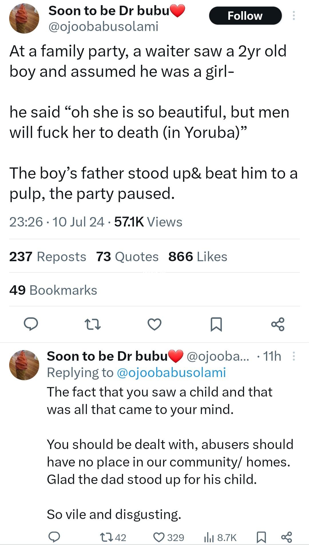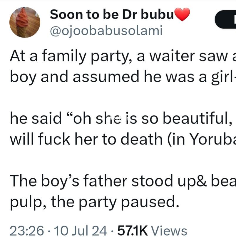 A father dealt with a waiter who made a sxual comment about his 2-year-old son. The incident was narrated on X. She wrote: “At a family party, a waiter saw a 2yr old boy and assumed he was a girl. “He said ‘oh she is so beautiful, but men will fuck her to death (in Yoruba)’ “The boys father stood up& beat him to a pulp, the party paused. She added: “The fact that you saw a child and that was all that came to your mind.   “You should be dealt with, abusers should have no place in our community/ homes.   “Glad the dad stood up for his child. “So vile and disgusting.” The post Boy’s father deals with waiter who sxualised his son after thinking he was a girl appeared first on www.adng.ng Get free adverts. An Ad search engine .