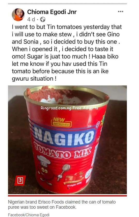 Chioma Okoli, who has a large following on Facebook, wrote in an online review that a can of Nagiko Tomato Mix, made by Nigerian company Erisco Foods, was ‘too sweet’.
