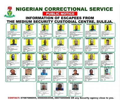 The Nigerian Correctional Service, (NCoS) has released details of biometric information of some escapees from the Medium Security Custodial Centre, Suleja, under the Federal Capital Territory (FCT) Command. LIB had reported in April this year that 119 inmates of the correctional center fled after the facilitys perimeter wall collapsed following a heavy downpour. Some of the inmates were immediately recaptured while security forces were still on the trail of the majority of them. The Correctional Service said it had become pertinent to publish their biometric details to recapture them and bring them back into custody. The Service had earlier published biometric details of 18 of the fleeing inmates. In a statement released, the center’s public relations officer of the service, Abubakar Umar, said the information about the fugitives is published for sister security agencies as well as the general public to look out for them in an attempt to recapture them and bring them back to the facility. Umar enjoined Nigerians to cooperate with the Service to recapture the fleeing inmates as they pose a danger to public safety and national security. The general public is further informed that the Nigerian Correctional Service has since deployed overt and covert strategies towards recapturing all escapees while ensuring that security in custodial facilities nationwide is beefed up to forestall any security breaches. If any of the escapees is sighted, the public can report to the nearest security agent or agency or may call the following numbers: 07087086005, 09060004598, or 08075050006. The public can also contact us through our email at: info@corrections.gov.ng or complaintsresponsedesk@corrections.gov.ng, Umar saidThe post Correctional Service releases biometric information on 31 fleeing inmates Appeared first on X.ADNG.NG FREE ADS TO 10000 SOCIAL MEIDIA USERS DAILY.