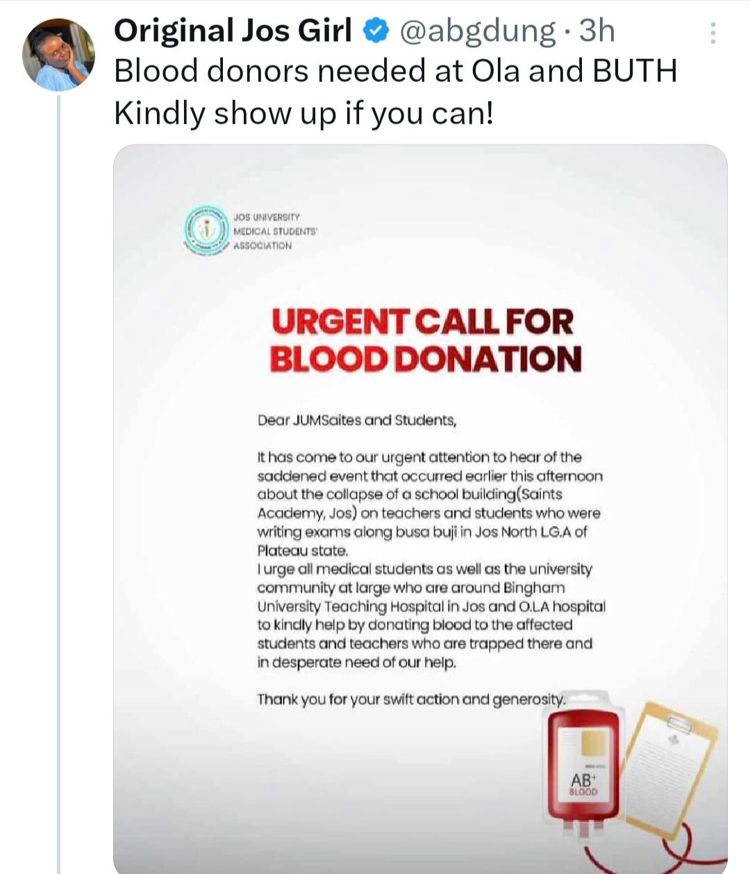 ”The situation is pathetic and tragic. I went to two hospitals where I saw 16 de@d bodies deposited at the mortuaries and also some injured students,” an eyewitness, Muhammad Shitu, told TRT Afrika. ”All the bodies I saw were of students. The situation is too terrible. Those who survived have lost excess blood, and people are rushing to donate blood,” Shitu added. An injured student Wulliya Ibrahim told AFP: “I entered the class not more than five minutes, when I heard a sound, and the next thing is I found myself here.” “We are many in the class, we were writing our exams,” he said. The National Emergency Management Agency said the building collapsed k!lling “several students” without giving details. “NEMA and other critical stakeholders are presently carrying out Search and Rescue operations,” it said. A resident at the scene Chika Obioha told AFP he saw at least eight bodies at the site and that dozens more had been injured. See a video.i.ng copyright. BreakingBLOOD DONORS NEEDED IN JOS!BLOOD DONORS NEEDED IN JOS!BLOOD DONORS NEEDED IN JOS!Are you near Ola or Bingham hospital in Jos? Help A child being rescued from school building that fell today in Jospic.twitter.com/J6z1ZGMpxq Elle (@sweetsixtien) July 12, 2024 The post De@th toll in Jos school building coll@pse rises to 21 as volunteers use shovels to dig out students (photos/video) appeared first on swordpress.com.ng.