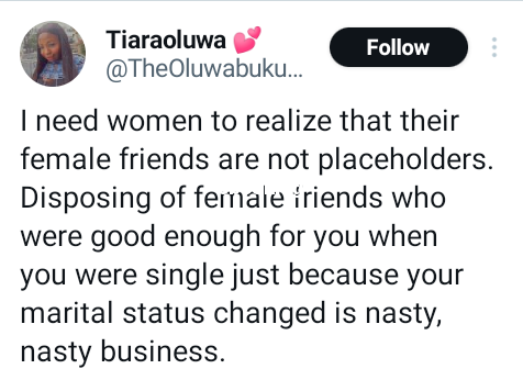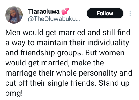 A Nigerian lady, Oluwabukunmi, has addressed married women who cut off their single friends after marriage. I need women to realize that their female friends are not placeholders. Disposing of female friends who were good enough for you when you were single just because your marital status changed is nasty, nasty business, she wrote in a post on Wednesday. Men would get married and still find a way to maintain their individuality and friendship groups. But women would get married, make the marriage their whole personality and cut off their single friends. Stand up omg.