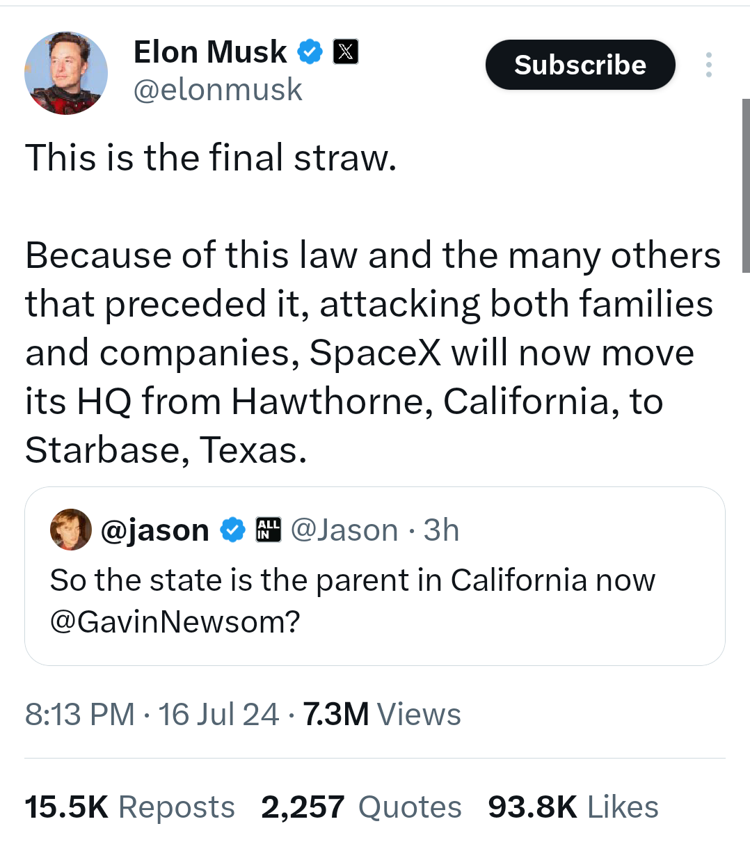 Im Elon Musk has announced he will officially be moving his company’s headquarters to Texas. Musk announced on X on Tuesday, July 16 that SpaceX is relocating from Hawthorne, California, to Starbase, Texas, citing a new law in California banning schools from telling parents their child is transgender Saying the laws are “attacking both families and companies” Musk also said X would also move its headquarters to Austin from San Francisco, claiming that he has “had enough of dodging gangs of violent drug addicts just to get in and out of the building.” The billionaire CEO said the decision was a response to a bill signed Monday by Gov. Gavin Newsom that prohibits “forced disclosure” rules in public K-12 schools.Eight Republican run states now have laws that require teachers to notify parents if a child changes their name, pronouns, or gender identity at school but California is the first to outlaw such requirements.Musk, who had a highly public falling out with one of his children over their gender identity, called the move “the last straw” and alleged families would have to “leave California to protect their children.”