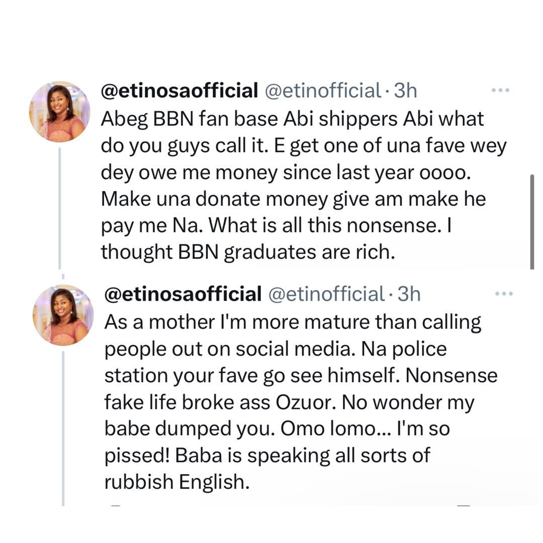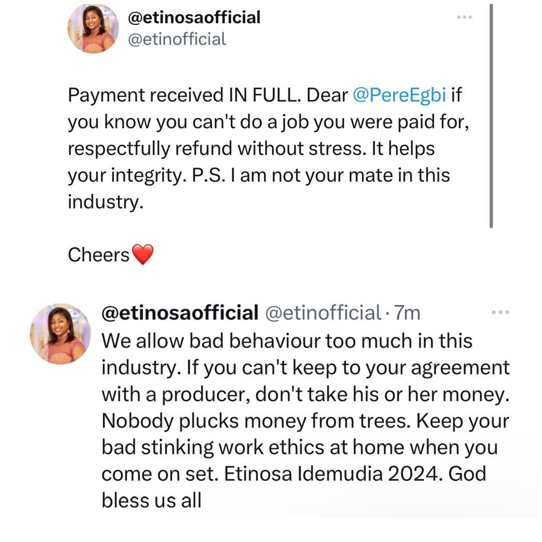 Actress Etinosa Idemudia, has called out BBNaija star, Pere Egbi, for allegedly failing to refund money for an acting gig he did not do. It appears the actress had employed the services of Pere for a movie role but he failed to show up for the job and refused to refund the movie. This evening, the actress via her X handle took to her handle to express her displeasure, but did not mention any name. It appears Pere was informed of her posts and immediately made a refund. Etinosa while acknowledging the refund, revealed it was Pere she was referring to. Read her post below