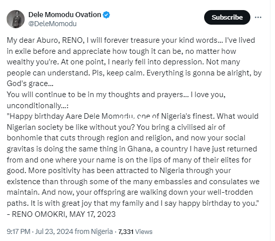 Publisher, Dele Momodu, has reacted to a recent interview Reno Omokri granted in which he took a swipe at the Ovation publisher. Reno in his interview stated that he wonders how a Yoruba graduate who runs an Owambe magazine can be an expert on the Nigerian economy. Momodu is a graduate of Yoruba Language and runs society magazine called Ovation. Responding to Renos statement, Momodu wrote;My dear Aburo, RENO, I will forever treasure your kind words… I’ve lived in exile before and appreciate how tough it can be, no matter how wealthy you’re. At one point, I nearly fell into depression. Not many people can understand. Pls, keep calm. Everything is gonna be alright, by God’s grace…You will continue to be in my thoughts and prayers… I love you, unconditionally…:”Happy birthday Aare Dele Momodu, one of Nigeria’s finest. What would Nigerian society be like without you? You bring a civilised air of bonhomie that cuts through region and religion, and now your social gravitas is doing the same thing in Ghana, a country I have just returned from and one where your name is on the lips of many of their elites for good. More positivity has been attracted to Nigeria through your existence than through some of the many embassies and consulates we maintain. And now, your offspring are walking down your well-trodden paths. It is with great joy that my family and I say happy birthday to you.” – RENO OMOKRI, MAY 17, 2023”