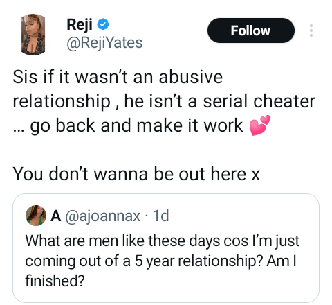 A UK-based Nigerian woman, Rejoice Ojiaku (Reji Yates) has advised a lady to go back to her man after she announced the end of her 5-year relationship. Reji, who gave the advice on X on Wednesday, said she should try and make the relationship work if the man isn’t abusive or a serial cheater. Sis if it wasnt an abusive relationship , he isnt a serial cheater go back and make it work,” she wrote. “You don’t wanna be out here she added