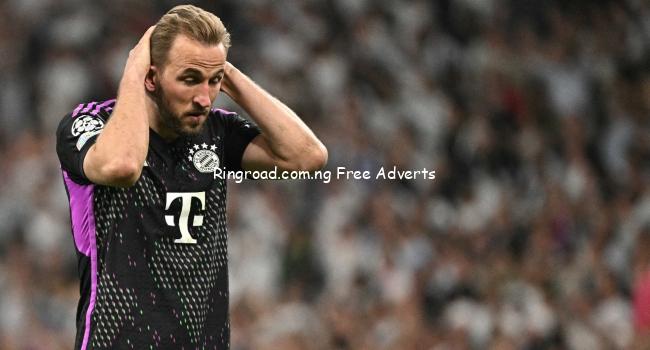 Bayern Munich’s English forward #09 Harry Kane reacts to their defeat after the UEFA Champions League semi final second leg football match between Real Madrid CF and FC Bayern Munich at the Santiago Bernabeu stadium in Madrid on May 8, 2024. (Photo by JAVIER SORIANO / AFP)