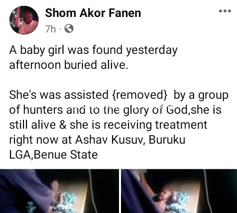A baby girl who was buried alive has been rescued by hunters in Ashav Kusuv community in Buruku Local Government Area of Benue State. According to the report, the baby was found buried in a shallow grave on Saturday afternoon, May 11, 2024. The child is currently receiving treatment in a hospital at Ashav Kusuv in Buruku.