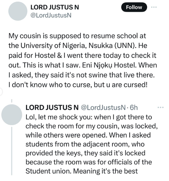 A Nigerian man has shared a video showing the deplorable state of a hostel room in University of Nigeria Nsukka. The man said his cousin, who is to resume in the institution, paid for the accommodation and he decided to pay a visit to the hostel and was stunned by how its state. He wroteMy cousin is supposed to resume school at the University of Nigeria, Nsukka (UNN). He paid for Hostel & I went there today to check it out. This is what I saw. Eni Njk Hostel. When I asked, they said it’s not swine that live there. I don’t know who to curse, but u are cursed!Let me shock you: when I got there to check the room for my cousin, was locked, while others were opened. When I asked students from the adjacent room, who provided the keys, they said it’s locked because the room was for officials of the Student union. Meaning it’s the best”