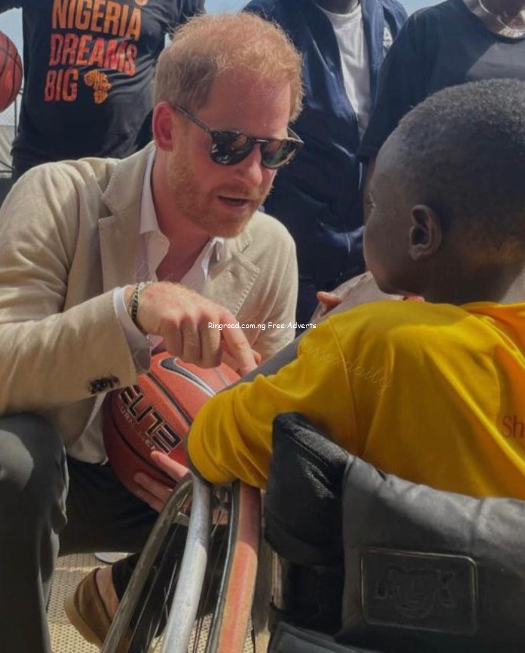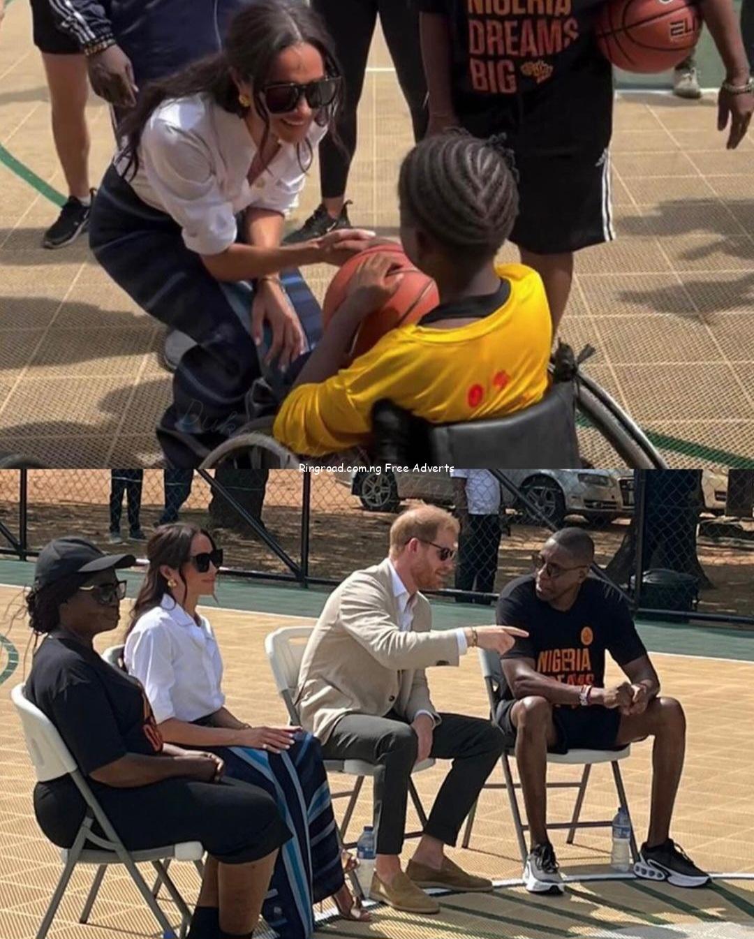 Abike Dabiri-Erewa, Chairman/CEO of the Nigerians in Diaspora Commission (NiDCOM), gifted the couple similar aso oke outfits yesterday at an event. It appears that’s what Meghan is wearing. After arriving at Lagos airport from Abuja, Harry and Meghan headed to a school to take part in a basketball clinic with non-profit Giants of Africa.