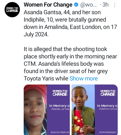 A 44-year-old woman, Asanda Gantsa and her 10-year-old son Indiphile, were brut@lly g*nned down in Amalinda, East London, South Africa. Advocacy group, Women For Change, disclosed this in a statement on Monday, July 22, 2024. According to the group, the mother and son were sh0t d3ad on 17 July. It is alleged that the shooting took place in the morning near CTM. Asandas lifeless body was found in the driver seat of her grey Toyota Yaris while her son was lying on the pavement next to the car on the passenger side. Both of them had gunshot wounds to their bodies. No arrests have been made as yet, and police are investigating two murder cases.