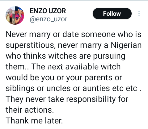 A Nigerian man, Enzo Uzodimma has advised people not to date or marry someone who is superstitious.    The post Never date or marry someone who is superstitious and believes witches are pursuing them – Nigerian man advises people appeared first on dotifi.com start an online business for free and earn .