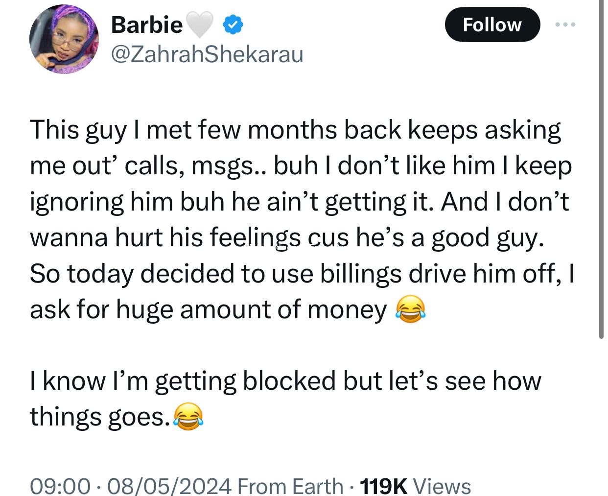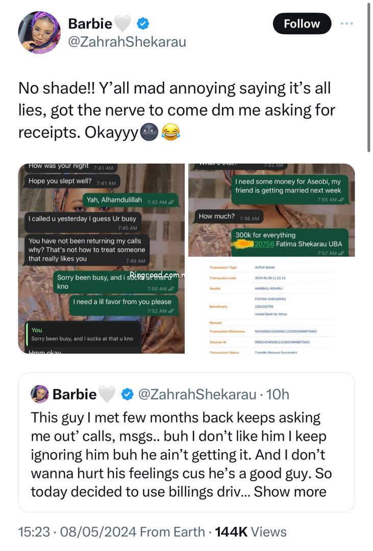 A Nigerian lady has tendered receipts after X users doubted a claim she made on her X handle. The lady wrote about a man who had been asking her out for a while, stating that though she rejected his advances, the young man refused to back off. She said she decided to ask him for N300,000 to scare him away. Three hours later, she came back to announce that the man sent her the money she asked for plus extra.
