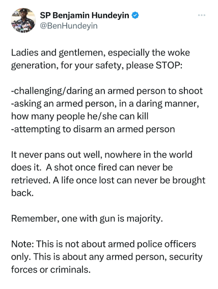 The spokesperson of the Lagos State Police Public Relations Officer, SP Benjamin Hundeyin, has cautioned woke Nigerians against provoking armed persons. In a post shared on his X handle on Monday, May 6, Hundeyin warned against challenging or daring an armed person to shoot or attempting to disarm an armed person. He stressed that such actions never end well, anywhere in the world. He wrote;Ladies and gentlemen, especially the woke generation, for your safety, please stop challenging/daring an armed person to shoot, asking an armed person, daringly, how many people he/she can kill or attempting to disarm an armed person. It never pans out well. Nowhere in the world does it. A shot once fired can never be retrieved. A life once lost can never be brought back. Remember, one with gun is majority. Note: This is not about armed police officers only. This is about any armed person, security forces, or criminals.