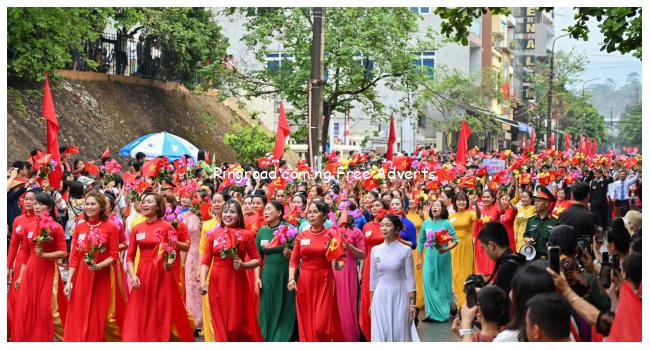 Outside the stadium, thousands of people wearing ao dai — traditional Vietnamese dress — as well as people wearing clothes typical of local Thai and Hmong ethnic minorities queued in the streets to see the parade.