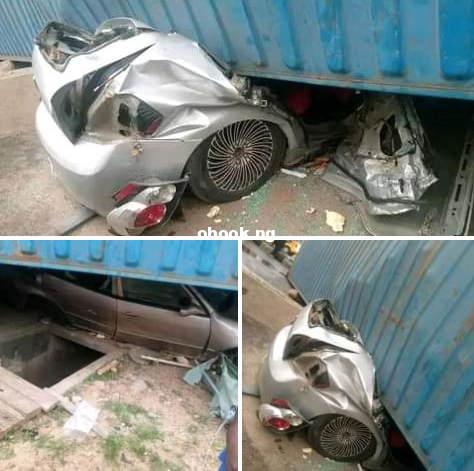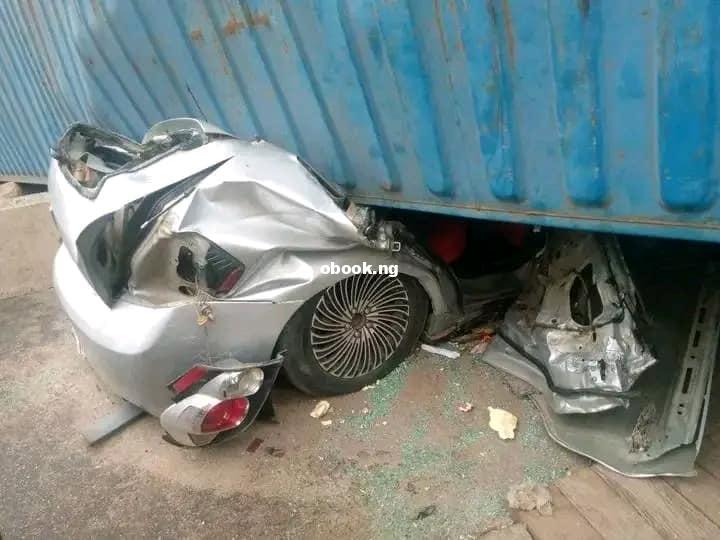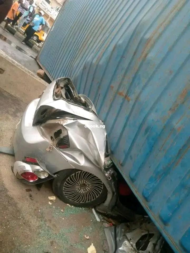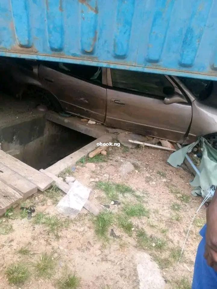 Several passengers were reportedly trapped in two cars crushed by an articulated truck at Lokogoma Market in Lokoja, Kogi State. According to the Daily Trust, the incident happened around 3.45 pm on Thursday, July 25, 2024, when the truck caught fire and a container it was carrying fell on the cars. It was gathered that the container fell on the cars after the driver lost control due to brake failure. However, an eyewitness who posted a video of one of the vehicles said nobody d!ed inside.