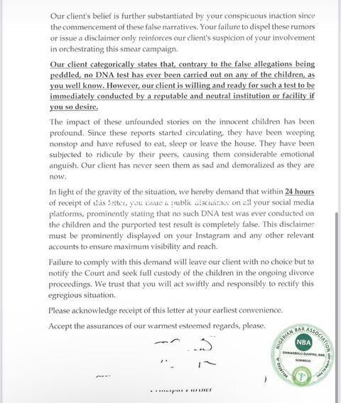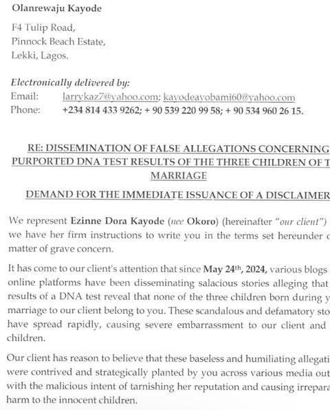 Also, according to Olanrewaju, Mrs. Kayode stole two Mercedes SUVs from him. She allegedly conspired with accomplices Jennifer Max Nduaguibe, Lynda Dike Anulika, and broker Ugochukwu Igboanugo to seize Mr. Kayode’s property ownership as she is a lawyer, worked as his agent and handled most of his businesses.Early on Saturday, May 25, reports surfaced online that a DNA test was taken to show that the kids did not belong to Kayode. Dora has now come out to deny the allegations through her legal representatives, who sent a letter to Kayode, ordering him to stop spreading malicious lies against their client and her kids in the media. She also said a DNA test was not conducted.The statement also asked the Super Eagles star to issue a public disclaimer, stating no DNA test was conducted on any of three kids they both share together.