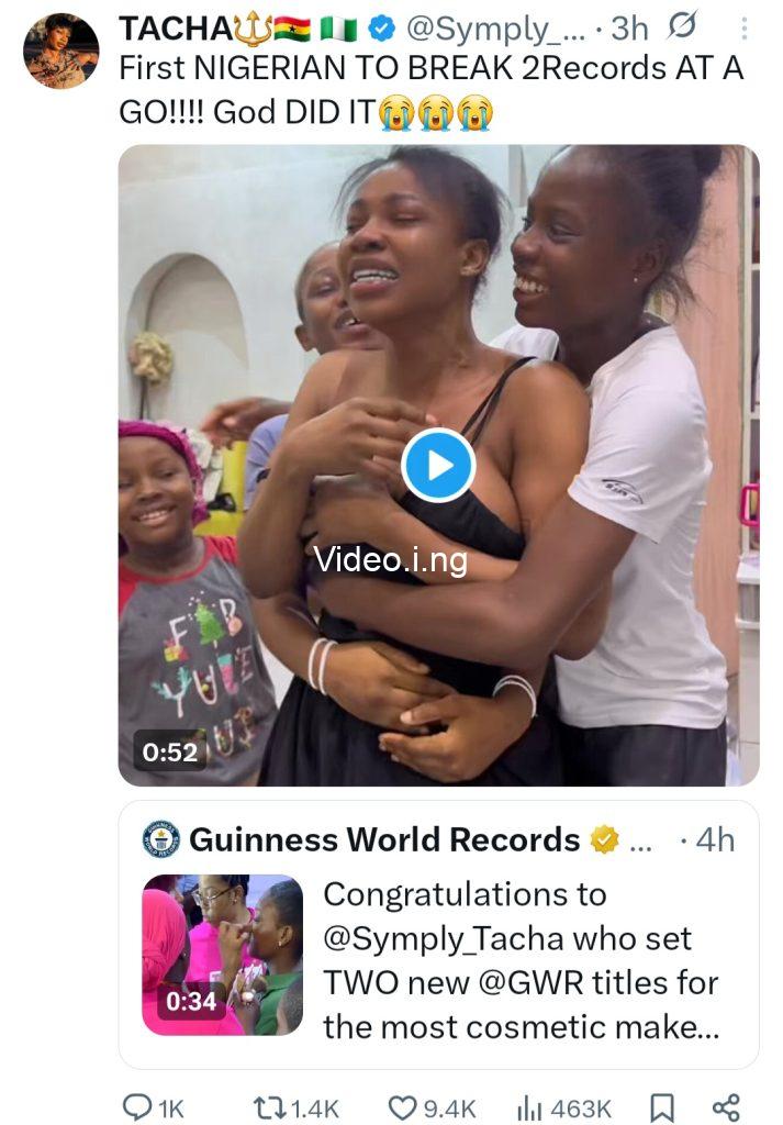 BBNaija star, Tacha could not hide her emotions after Guinness World Records officially confirmed that she has broken two world records.