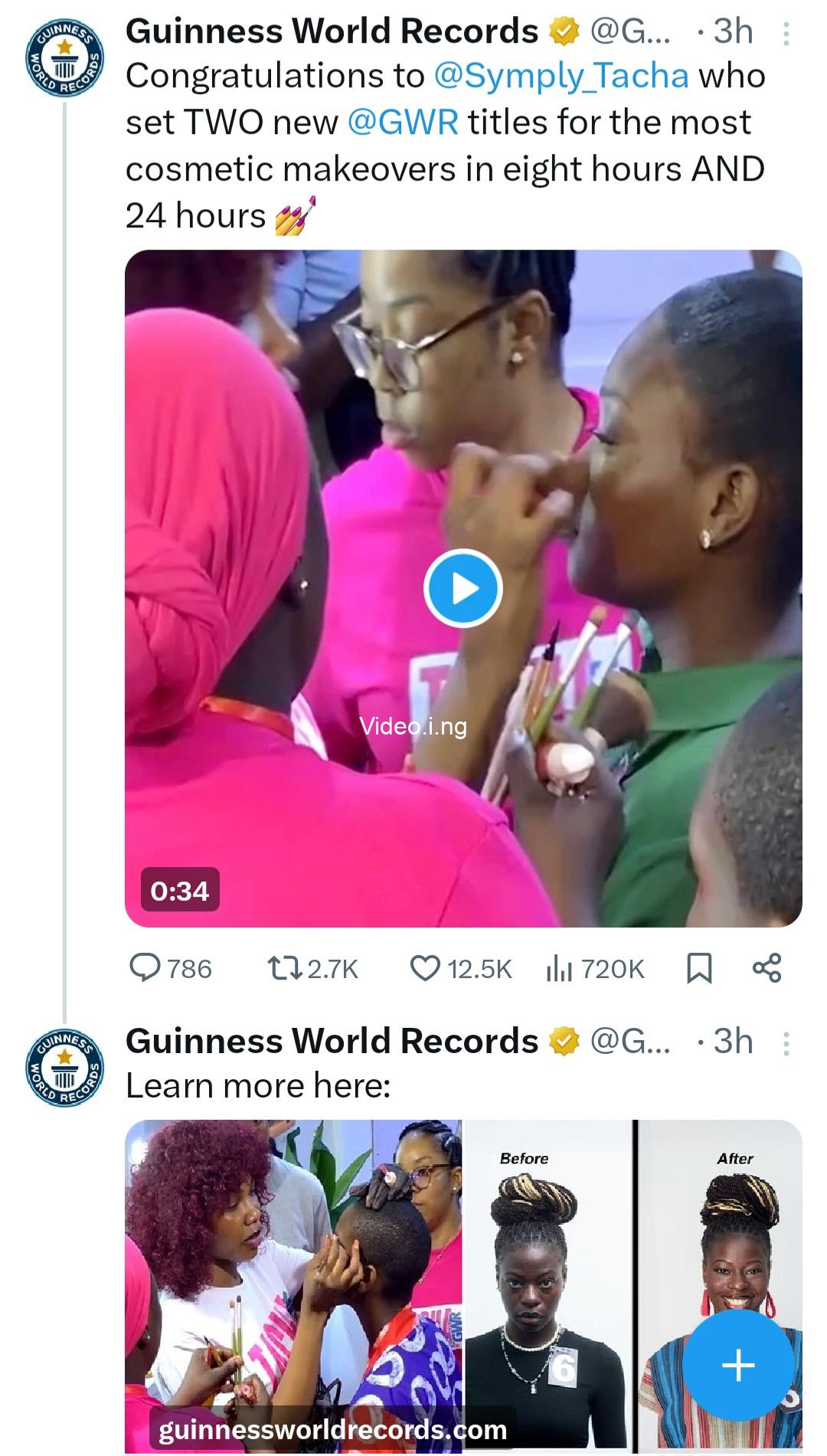 GWR tweeted: “Congratulations to @Symply_Tacha who set TWO new @GWR titles for the most cosmetic makeovers in eight hours AND 24 hours.”
