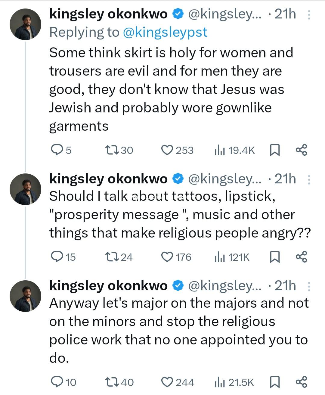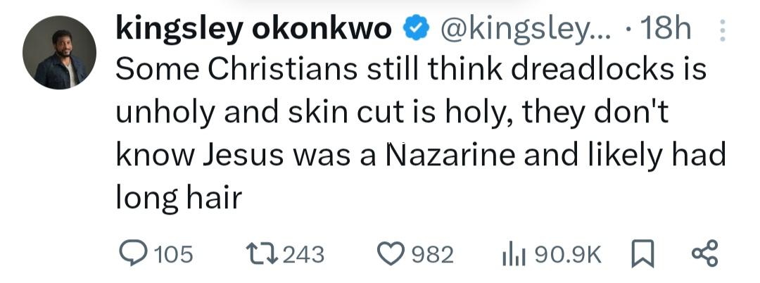 Pastor Kingsley Okonkwo has urged Christians to stop policing other Christians. He stated that many things Christians consider unholy are not.He wrote: “Some Christians still think dreadlocks is unholy and skin cut is holy, they don’t know Jesus was a Nazarine and likely had long hair.  “Some think skirt is holy for women and trousers are evil and for men they are good, they don’t know that Jesus was Jewish and probably wore gownlike garments. “Should I talk about tattoos, lipstick,  “prosperity message “, music and other things that make religious people angry?? Anyway let’s major on the majors and not on the minors and stop the religious police work that no one appointed you to do. The post “They don’t know Jesus was a Nazarine and likely had long hair,” Pastor Kingsley Okonkow tells Christians who think dreadlocks is unholy and skin cut is holy appeared first on dotifi.com start an online business for free and earn .