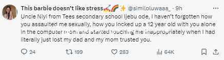 A young woman has accused her secondary school teacher of assaulting her sexually when she was just 12 years old. The woman identifies as Similoluwa wrote on X: Uncle Niyi from Tees secondary school Ijebu ode, I havent forgotten how you assaulted me sexually, how you locked up a 12 year old with you alone in the computer room and started touching me inappropriately when I had literally just lost my dad and my mom trusted you. She added: I havent forgotten how you were adjusting my bra and how you forcefully kissed me and told me that you just wanted the strawberry sweet in my mouth. I hope life is treating you as horribly as the panic attacks and depression I had as a child who had just lost her father. She then shared a photo of the teacher and his social media account as she continued to call him out. The post Woman calls out her secondary school teacher who allegedly molested her after her father died and her mother entrusted her to him appeared first on dotifi.com start an online business for free and earn .