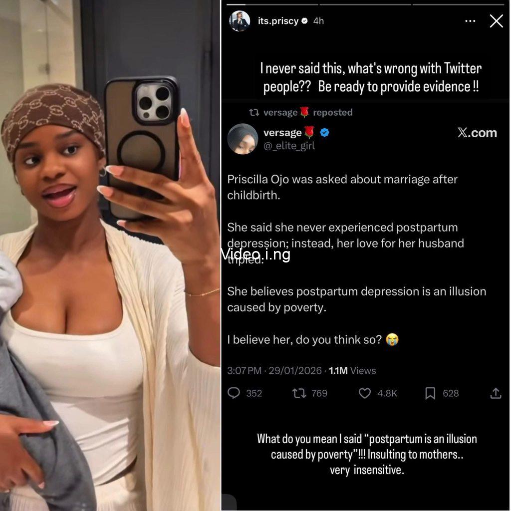 Priscilla reacted, stating that she never made such a statement. She added that downplaying postpartum depression is an insult to mothers. She went on to threaten to sue the X user.