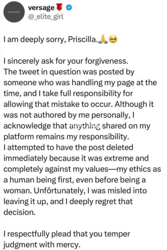 An X user who claimed Priscilla Ojo made a statement that “postpartum depression is an illusion caused by poverty” has been forced to beg for mercy.